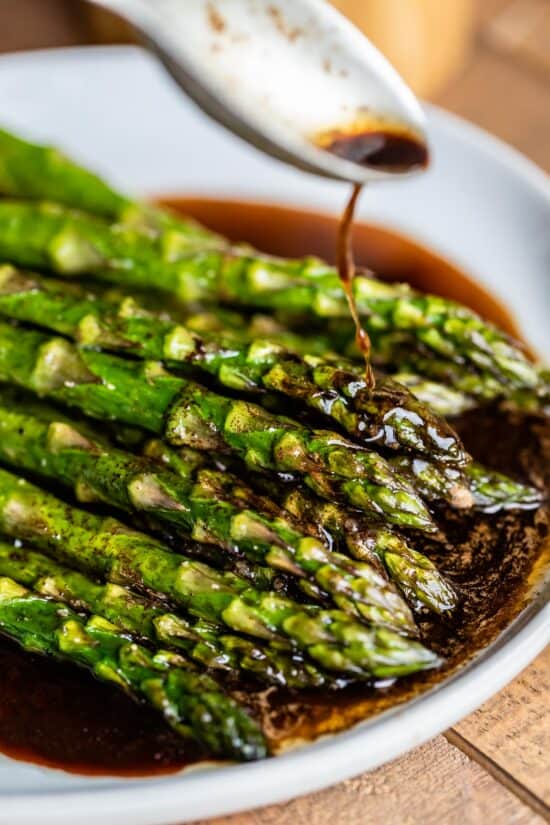 - Stir in 1 tablespoon each soy sauce and balsamic vinegar. Transfer asparagus to a serving plate. Drizzle sauce over asparagus, tossing to coat. Serve immediately.