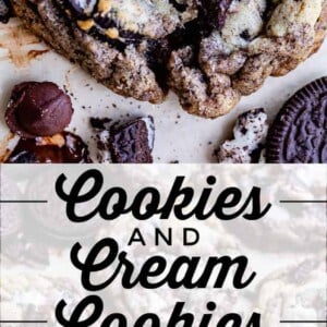 These Chewy Cookies and Cream Cookies are over the top! They are chocolate chip cookies that are loaded with chopped Oreos, dark chocolate, Hershey’s Cookies and Cream candy bars, plus they have crushed Oreos mixed into the dough. They are soft, thick, chewy, and totally irresistible!