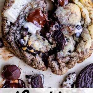 These cookies are the definition of over the top. I’m in love. We are taking a simple chocolate chip cookie recipe and folding in a bunch of Oreos, dark chocolate chips, and chopped up Hershey’s Cookies and Cream bars. (Have you ever had one of those? Sooo good.)