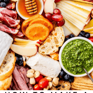 There are so many tips in the post, but the most simple rule to follow is the 3-3-3-3 rule: at least 3 cheeses, 3 meats, 3 starches, and 3 accompaniments (sauces, fruit, veggies, etc). This rule alone will help you have a successful board! Once you have those, you can add any little details you like, or if you are serving a large group then you can add to have 4-4-4-4, or however much you think you’ll need. There really isn’t a wrong answer here.