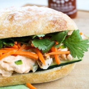 This turkey banh mi is a Vietnamese sandwich piled high with crisp cucumbers, pickled carrots, fresh cilantro, and spicy sriracha mayo. Leftover turkey is made for banh mi! Serve it up on baguettes or dinner rolls. It’s the easiest, tastiest upgrade for your turkey sandwiches. Originally published November 29, 2013.