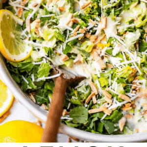 This Lemon Arugula Salad is the salad I would serve to every guest if I owned a restaurant. It is THAT good, and so versatile. It literally pairs with every dish. We are using arugula and romaine hearts for the greens. Some fresh herbs, lemon zest, grated Parmesan, TOASTY slivered almonds, and the perfect tangy Lemon Vinaigrette bring it all together! Top with Pickled Onions for a real treat. Make this tonight!