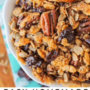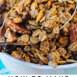 Granola is the best make-ahead breakfast. It’s full of nuts and whole grains and healthy stuff, with a hint of maple and cinnamon. Pair it with some plain yogurt, milk, or a smoothie. It’s so easy to make! Originally posted October 16, 2014.