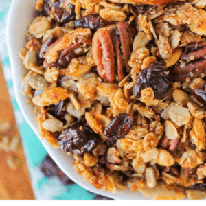 Yes! Granola is full of fiber, vitamins, and healthy fats from whole grains, nuts, and seeds, and even a small serving can help you feel full for a long time. It does have sugar from the maple syrup and honey and a little fat from the oil, but in moderation it’s a great addition to your diet.